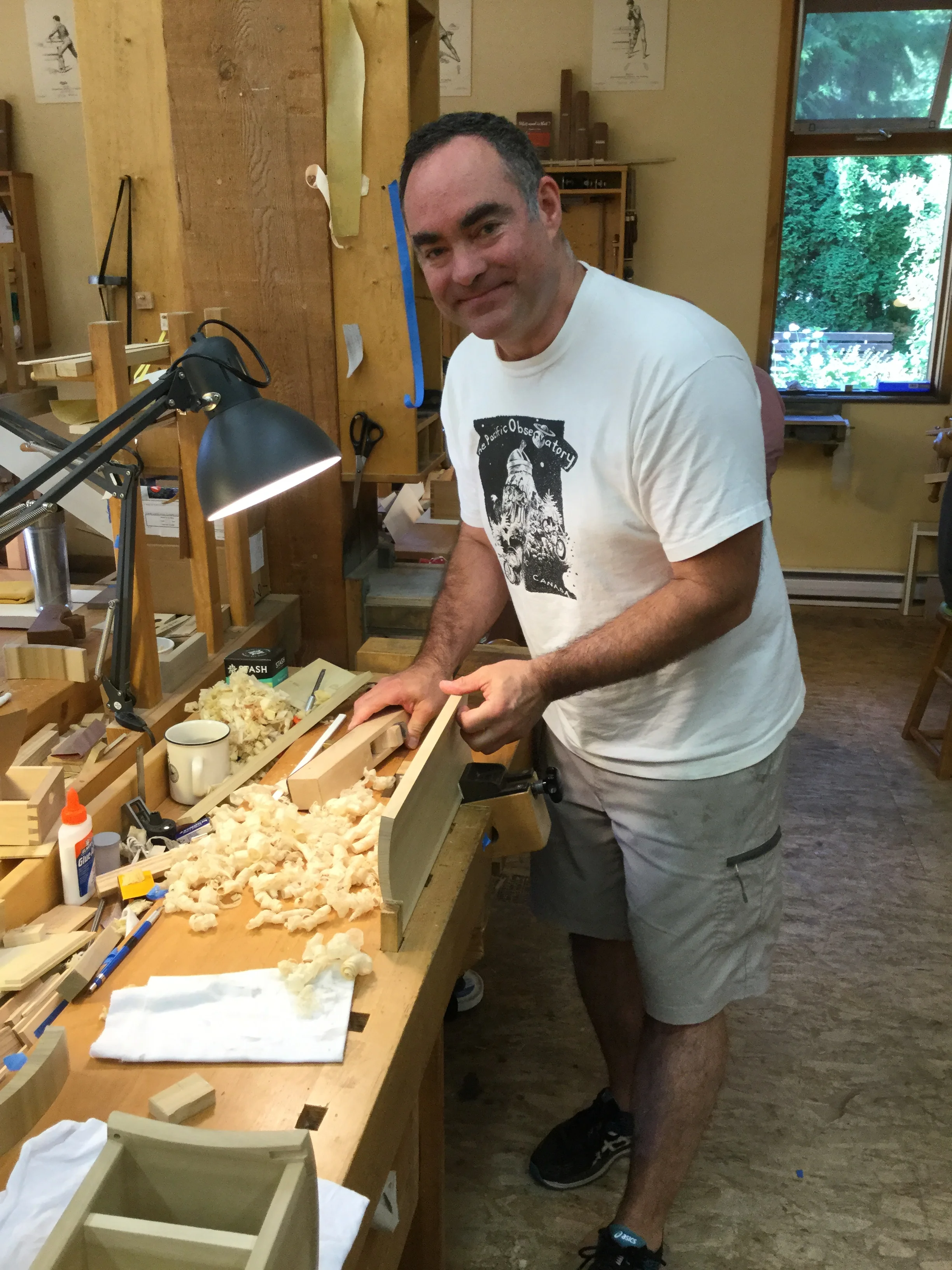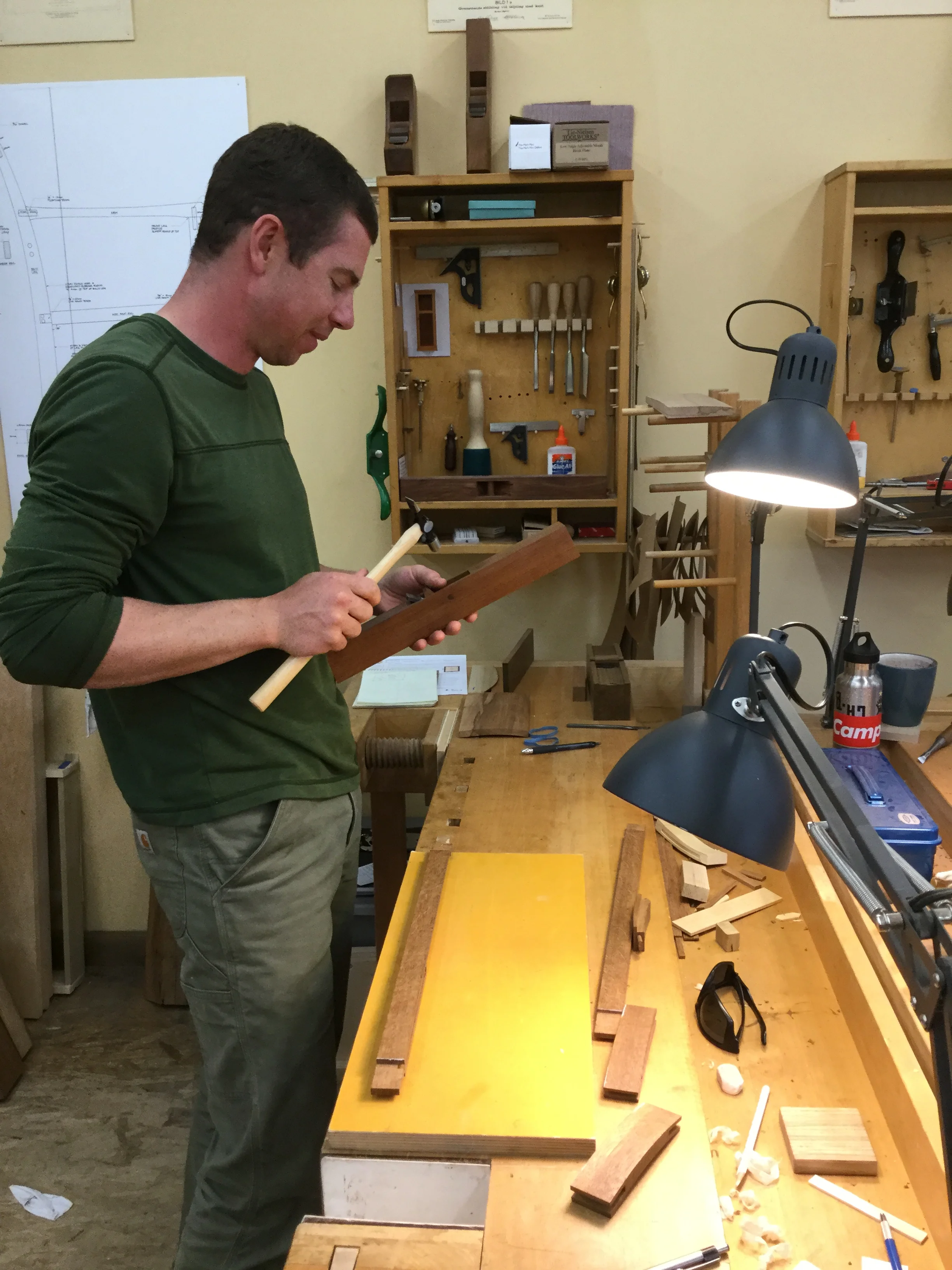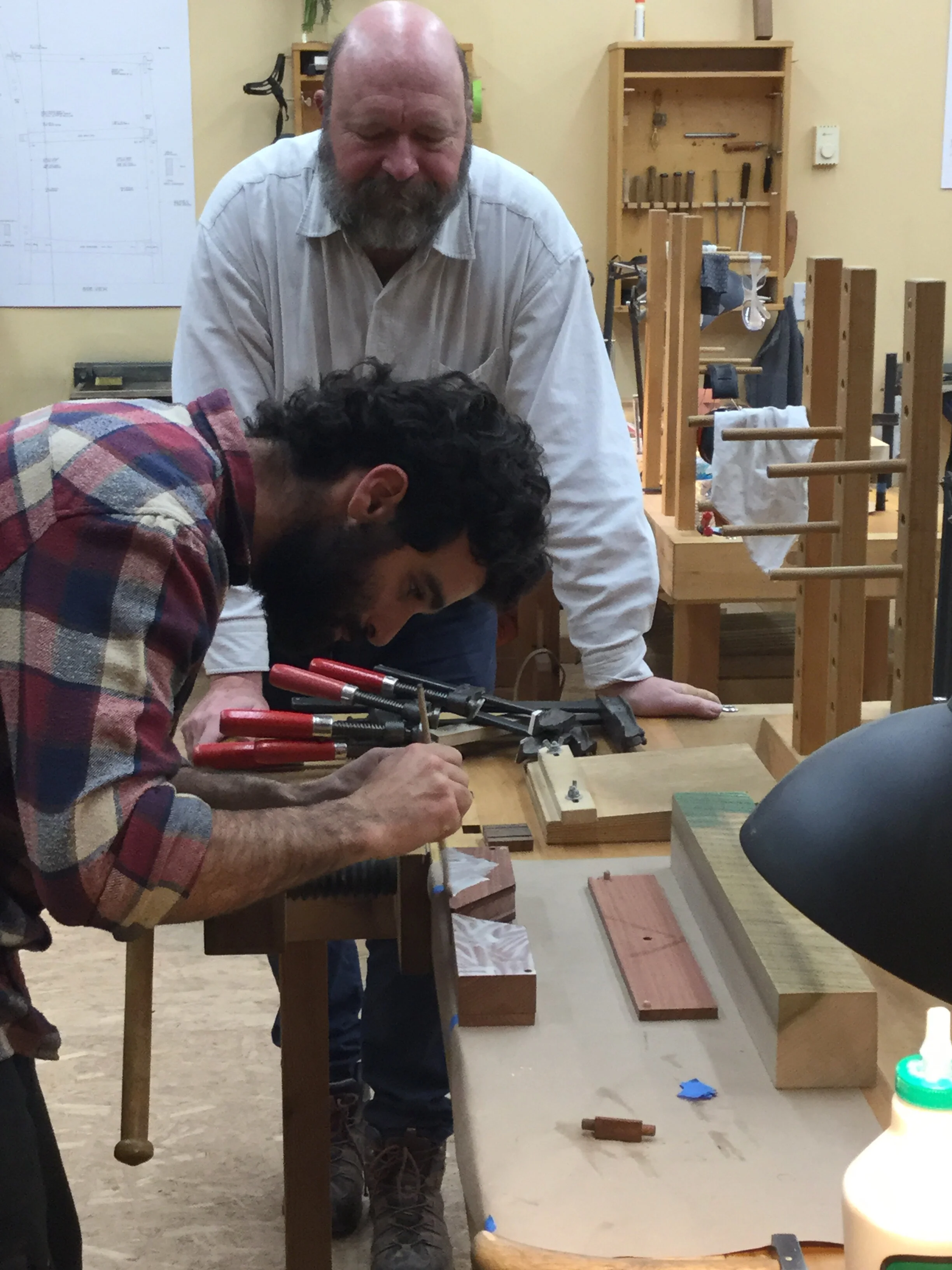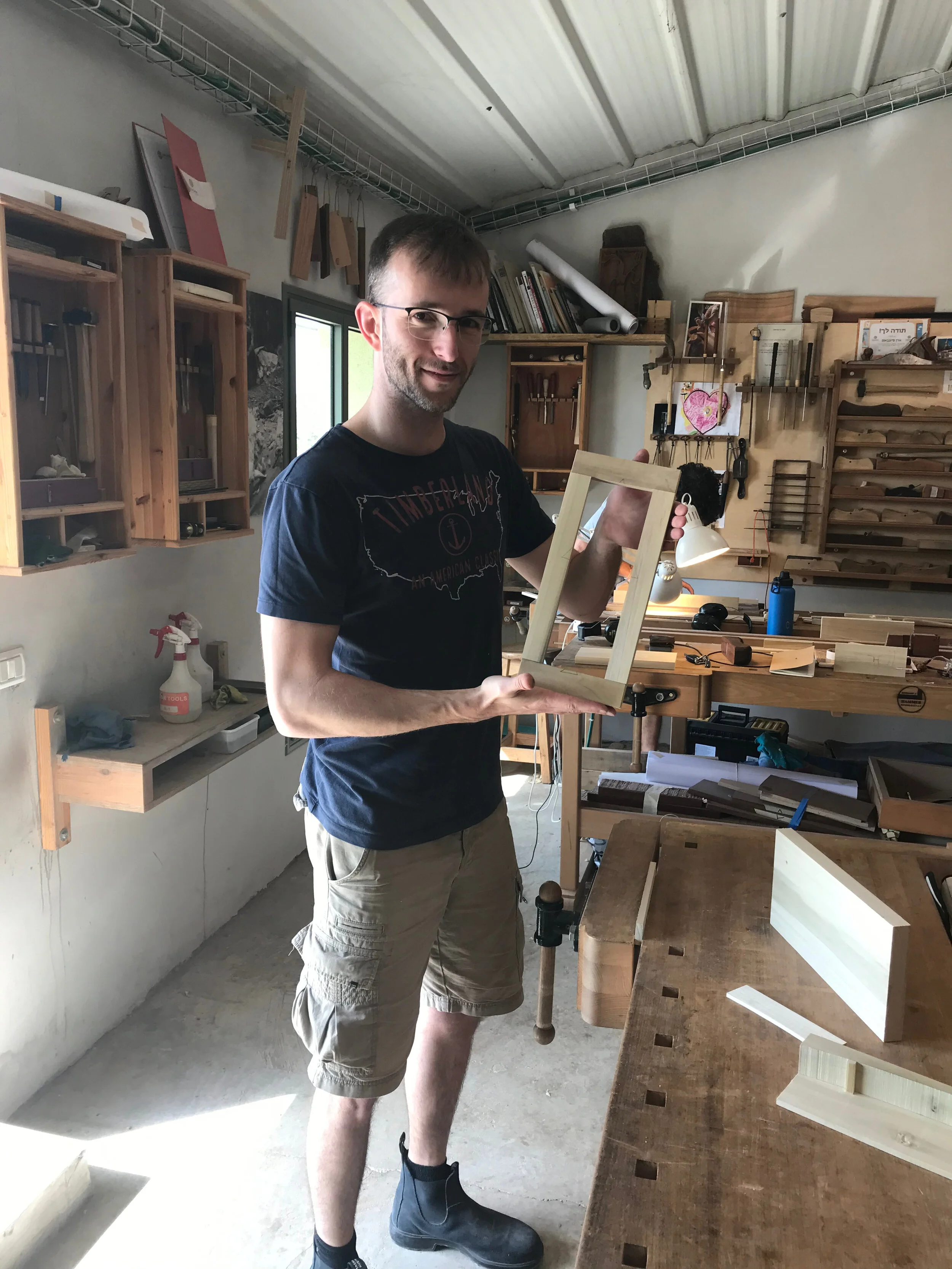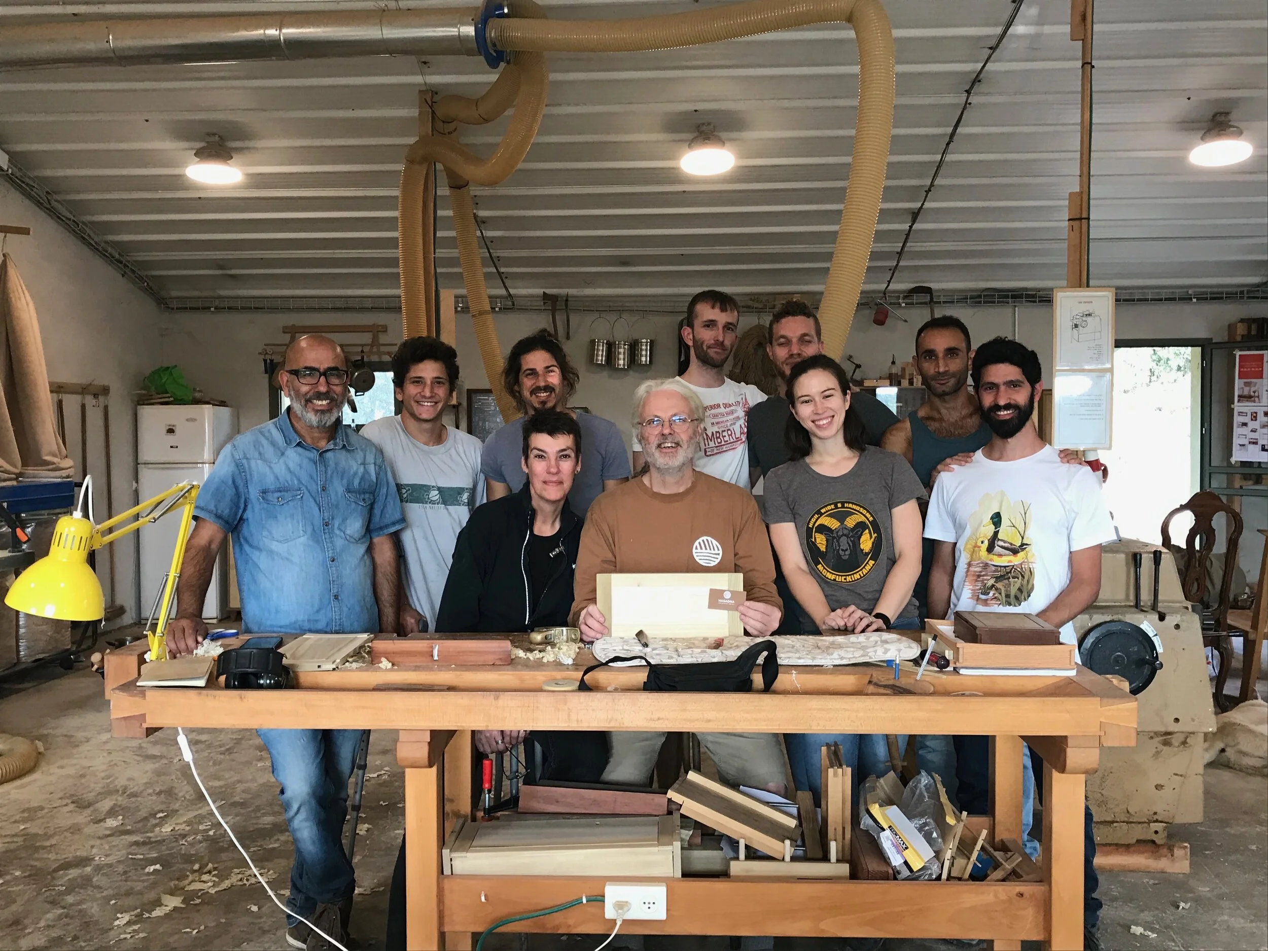 We had a full complement of students for both classes. The first class, curved bottom planes, began on the Sunday, with more than half the class staying on for the second class, curved frame and panel. In the second class, they had the opportunity to use the planes made in the first class to shape the panels in the latter. On the Tuesday evening, I gave a talk and slideshow with several of our own alumni as well as many students from each of the previous classes we taught in Israel attending. I am so grateful for all making such a considerable effort to join us. Most notably, it was so nice to catch up with Chen, Amir and of course Refeal who took both classes. It was also such a pleasure to catch up with my friend Moshe who was my bench mate during my first visit to Israel six years ago. I felt very grateful to have him in the second class.