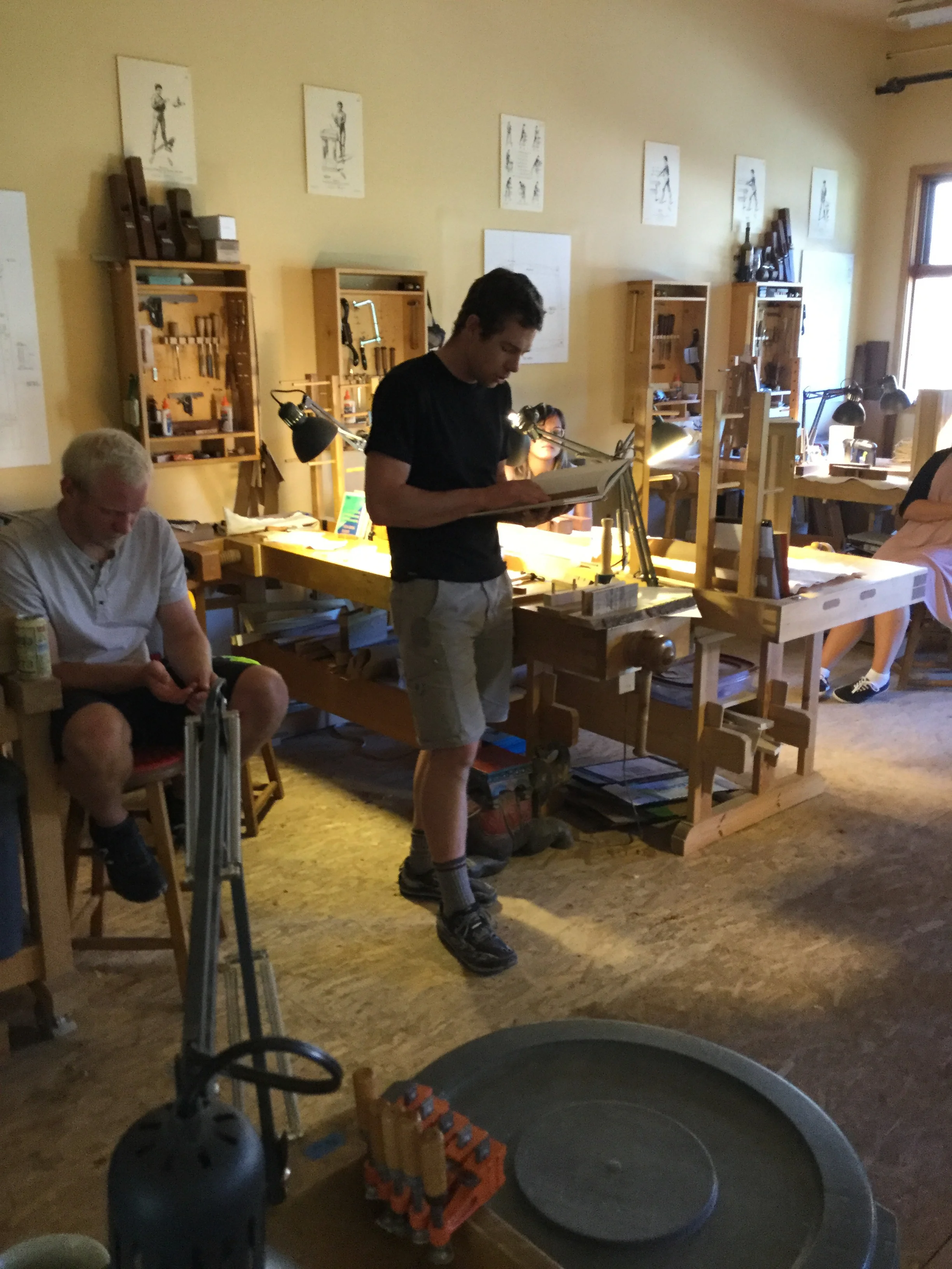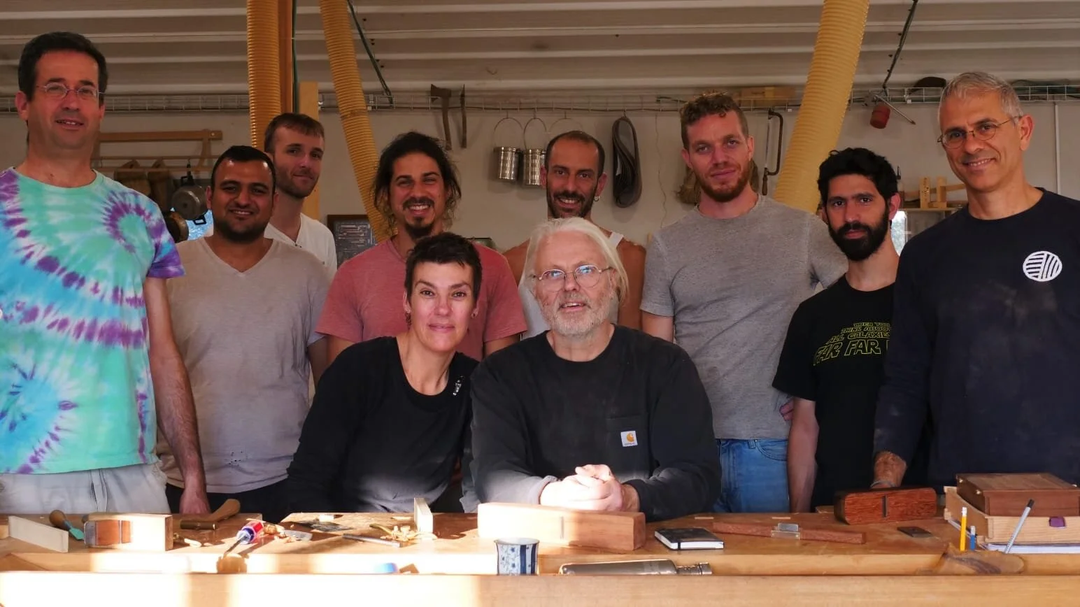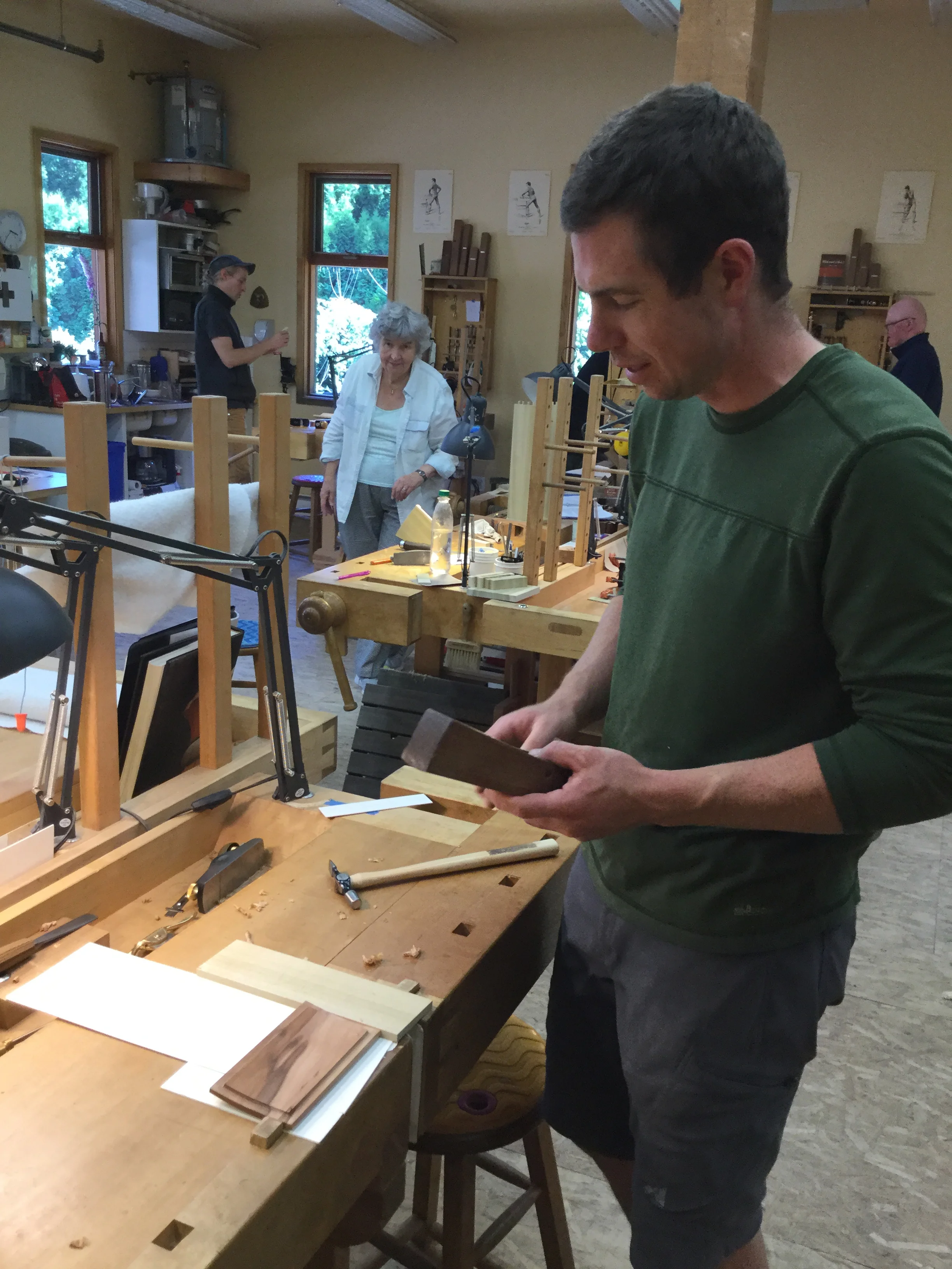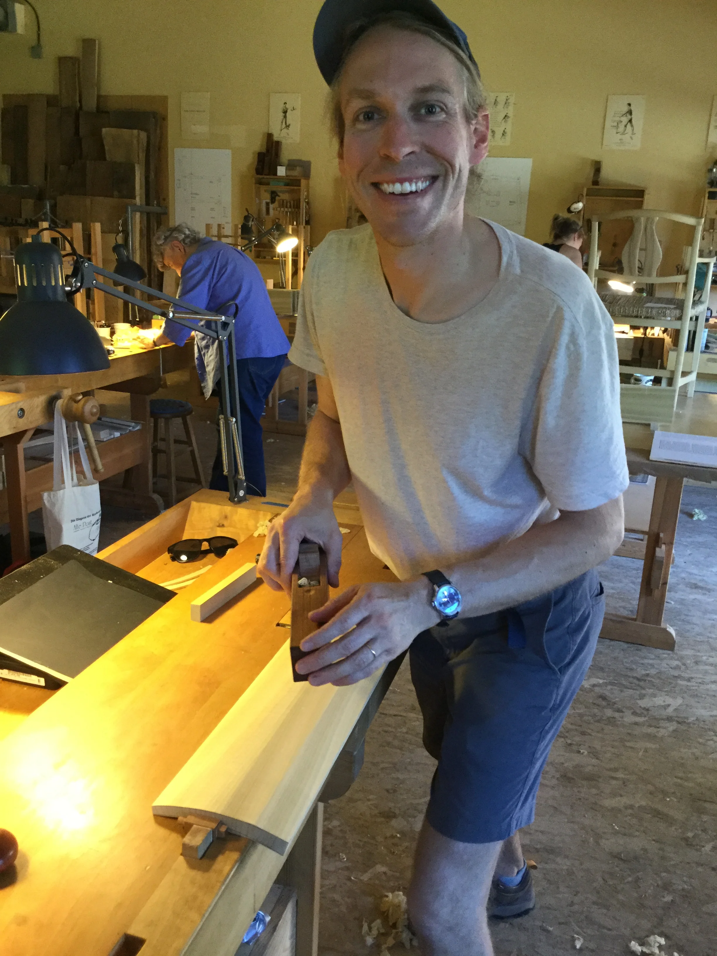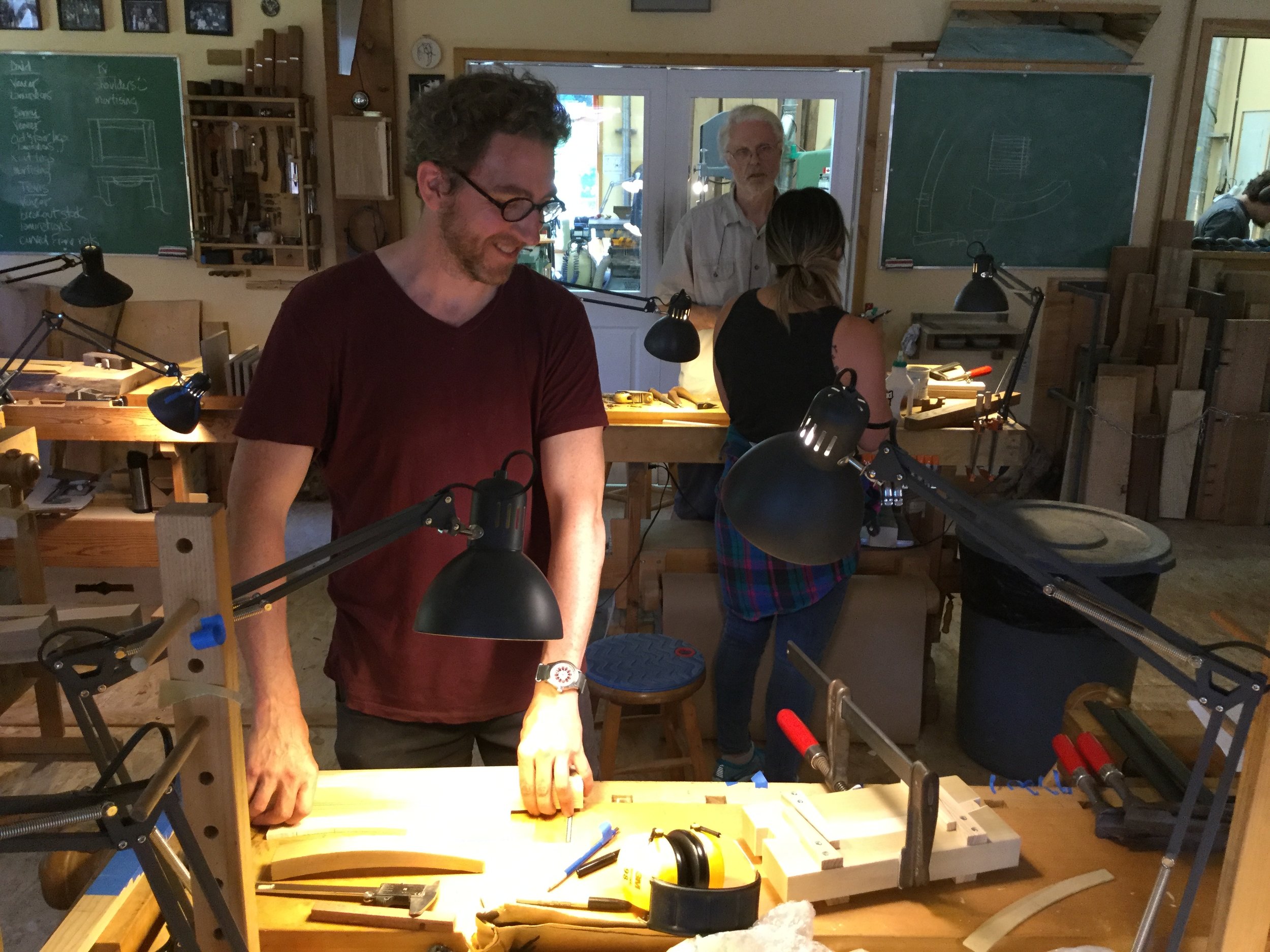 We had a full complement of students for both classes. The first class, curved bottom planes, began on the Sunday, with more than half the class staying on for the second class, curved frame and panel. In the second class, they had the opportunity to use the planes made in the first class to shape the panels in the latter. On the Tuesday evening, I gave a talk and slideshow with several of our own alumni as well as many students from each of the previous classes we taught in Israel attending. I am so grateful for all making such a considerable effort to join us. Most notably, it was so nice to catch up with Chen, Amir and of course Refeal who took both classes. It was also such a pleasure to catch up with my friend Moshe who was my bench mate during my first visit to Israel six years ago. I felt very grateful to have him in the second class.