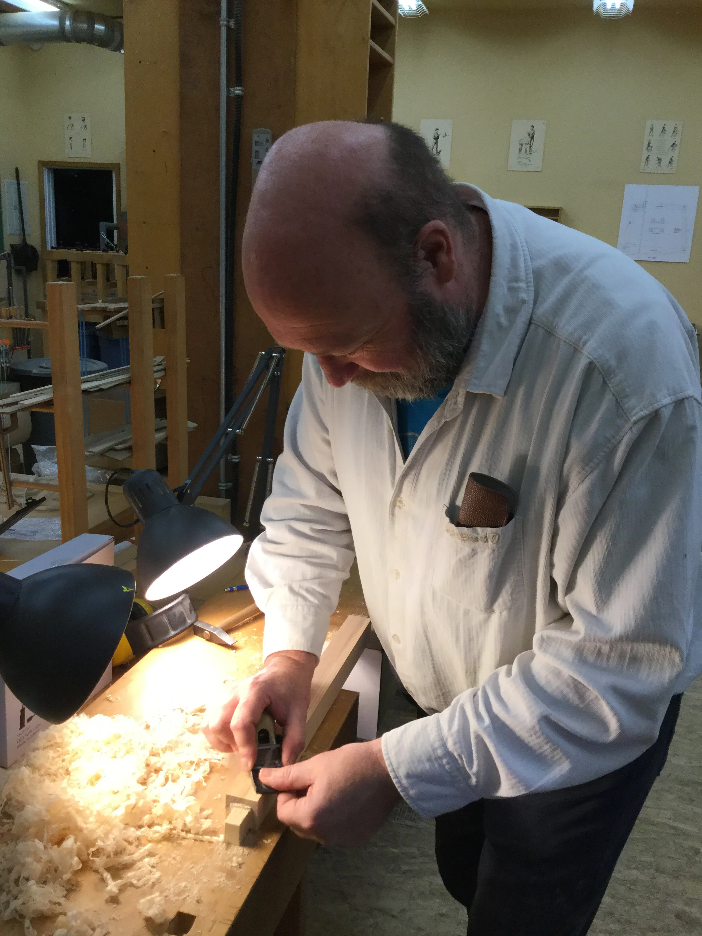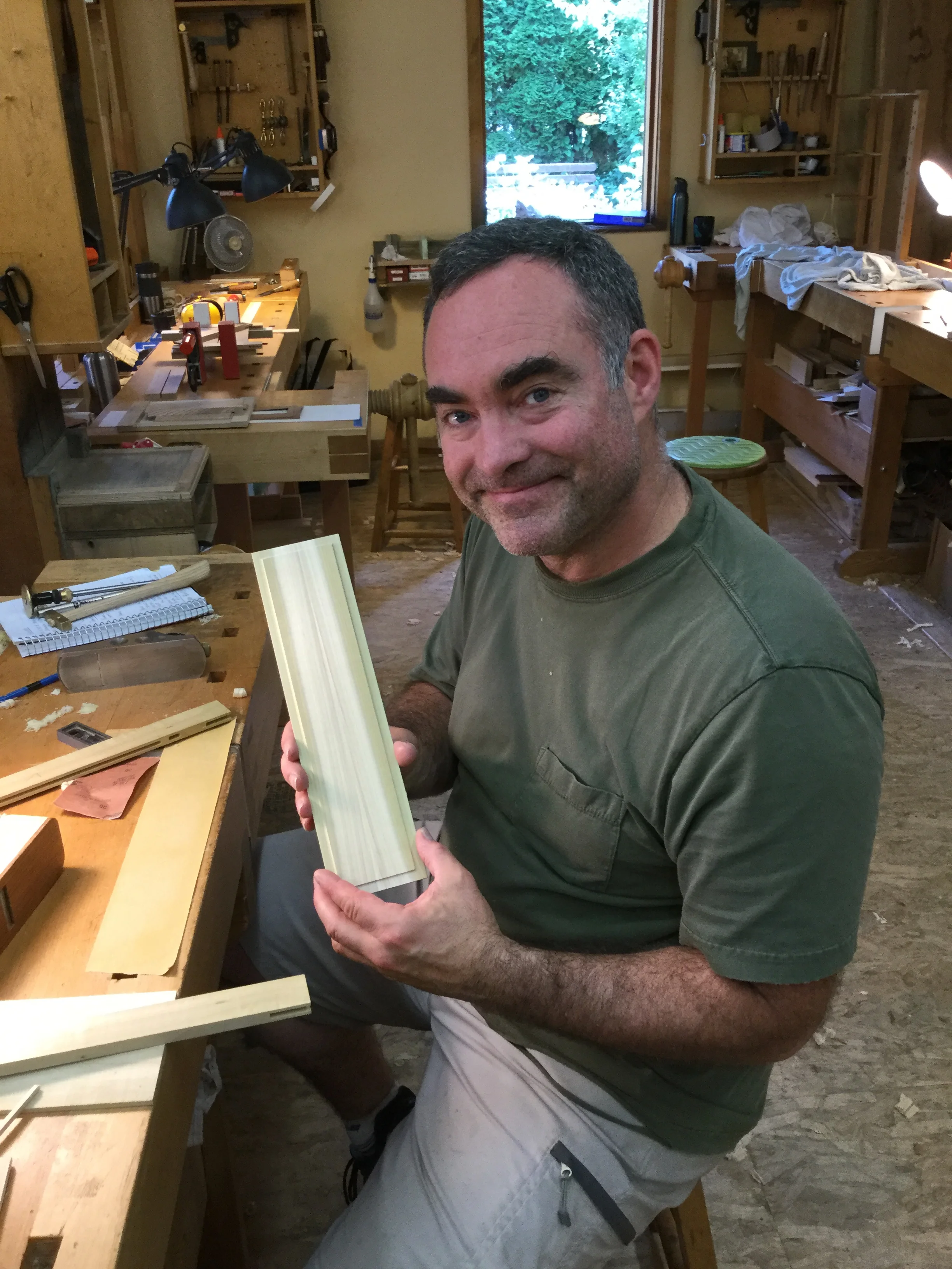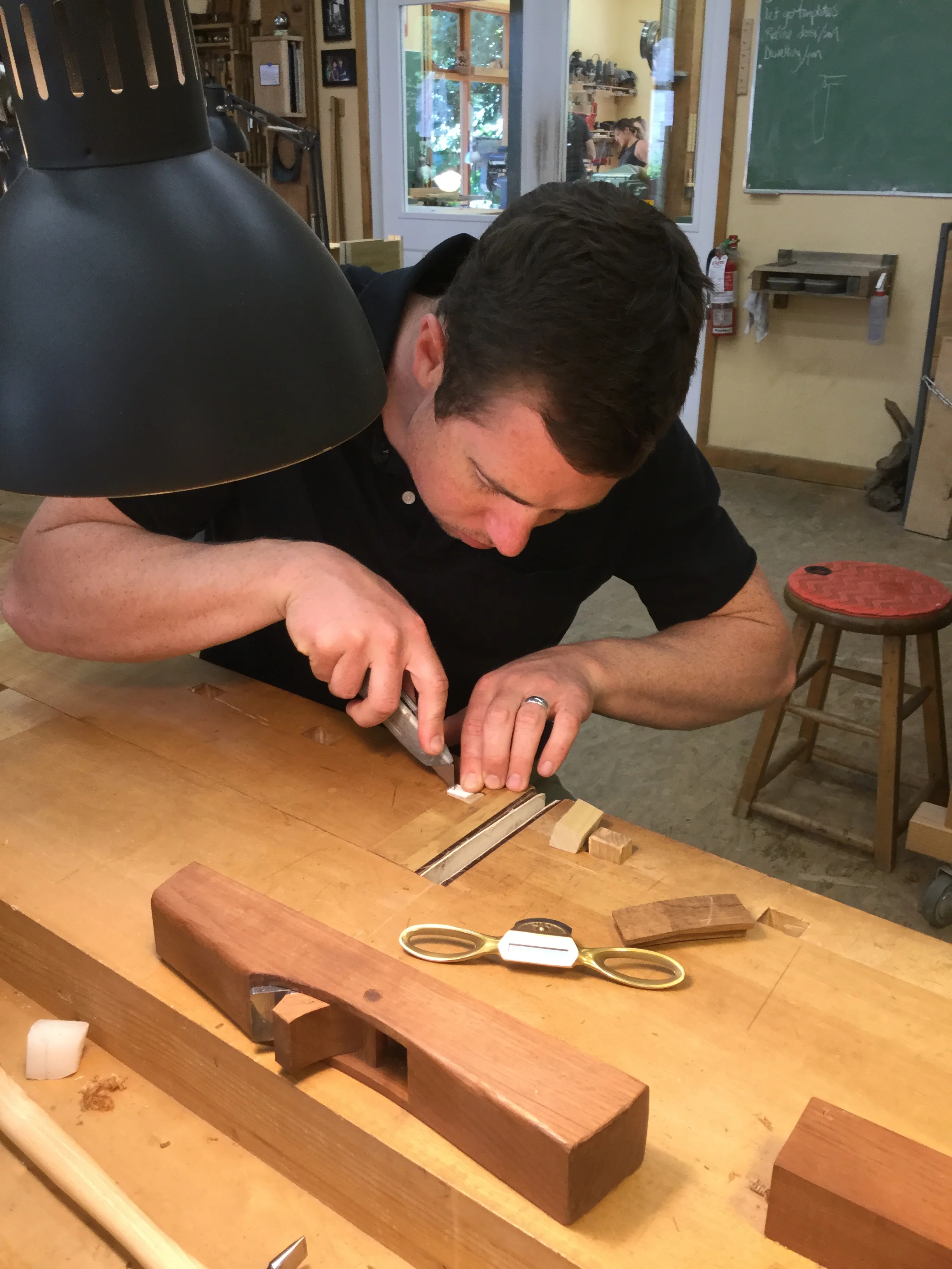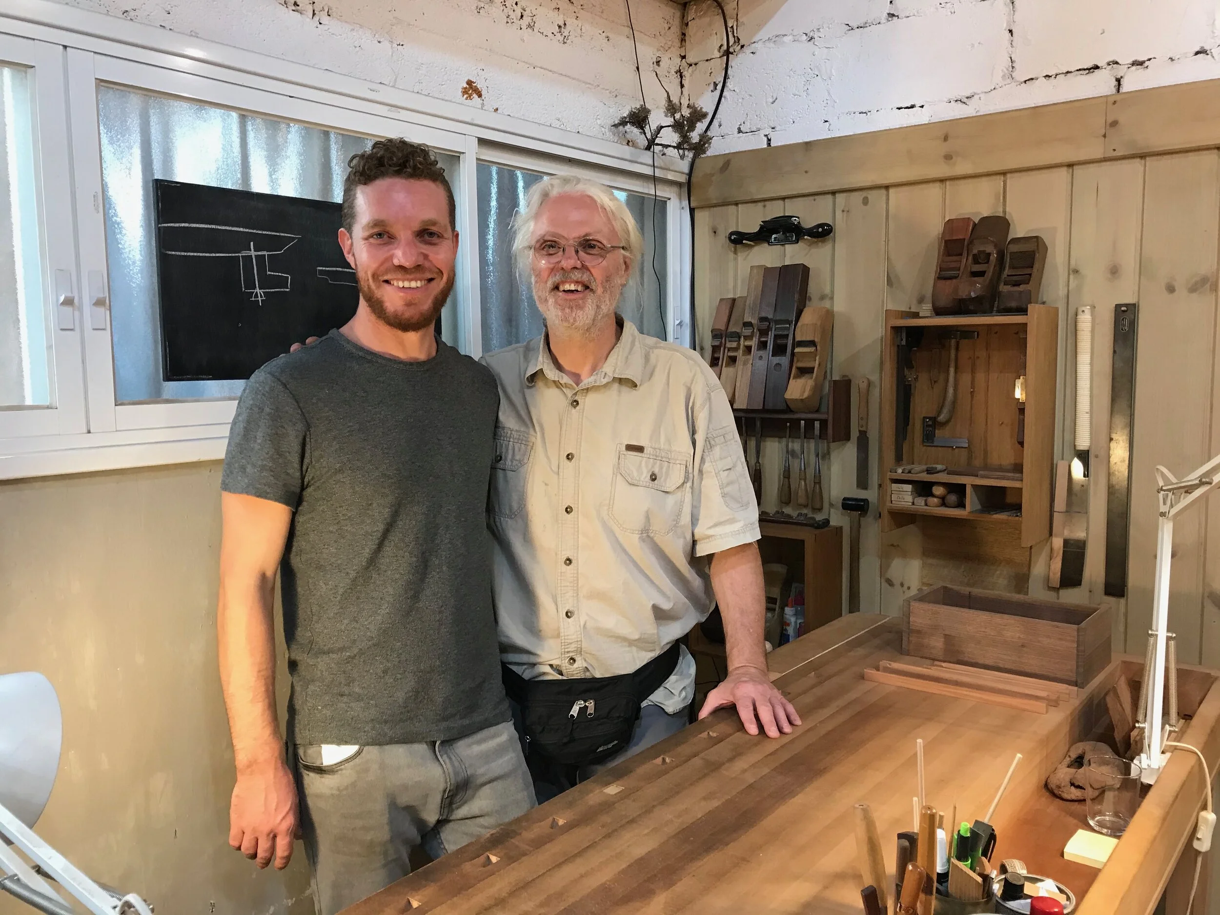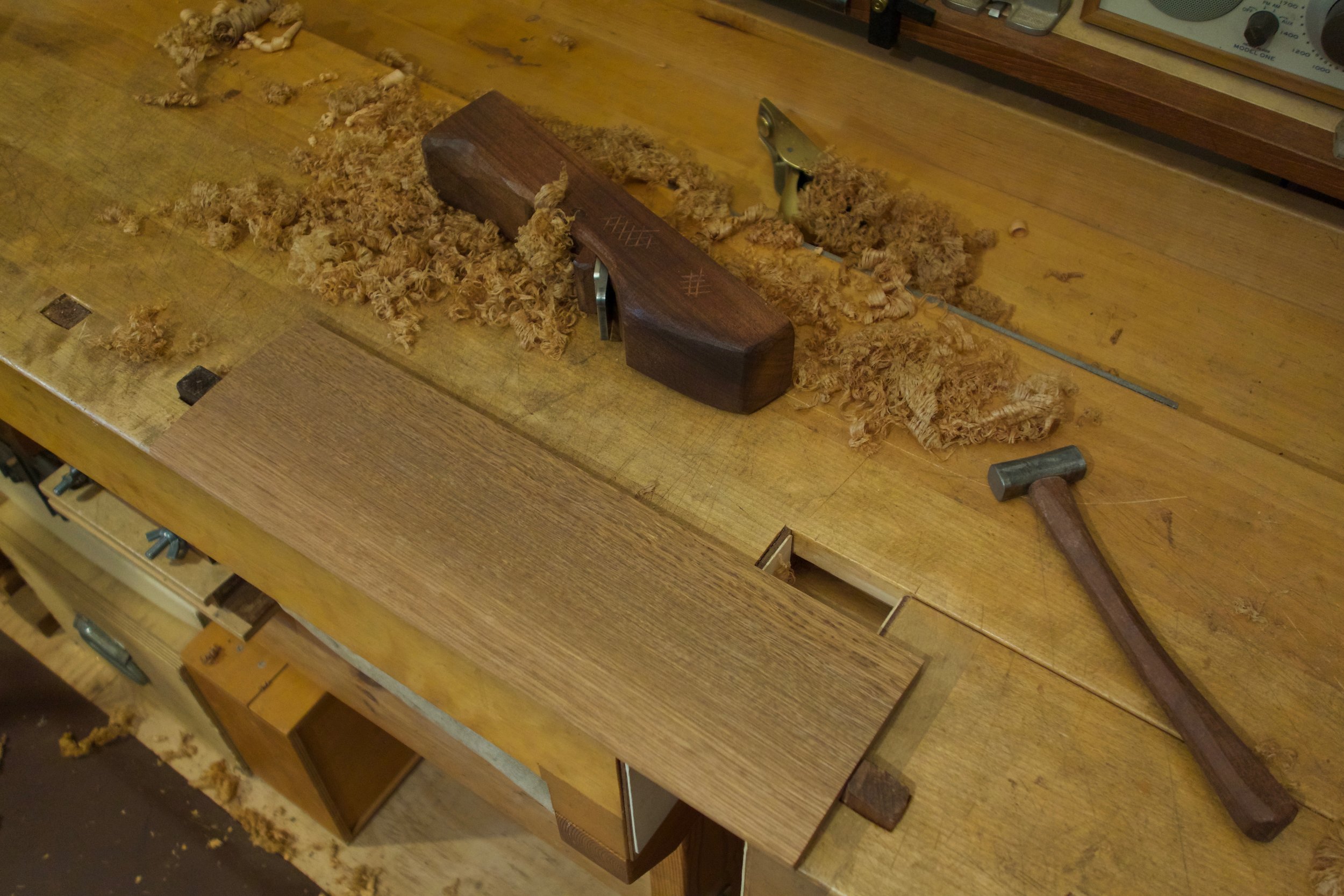 We had a full complement of students for both classes. The first class, curved bottom planes, began on the Sunday, with more than half the class staying on for the second class, curved frame and panel. In the second class, they had the opportunity to use the planes made in the first class to shape the panels in the latter. On the Tuesday evening, I gave a talk and slideshow with several of our own alumni as well as many students from each of the previous classes we taught in Israel attending. I am so grateful for all making such a considerable effort to join us. Most notably, it was so nice to catch up with Chen, Amir and of course Refeal who took both classes. It was also such a pleasure to catch up with my friend Moshe who was my bench mate during my first visit to Israel six years ago. I felt very grateful to have him in the second class.