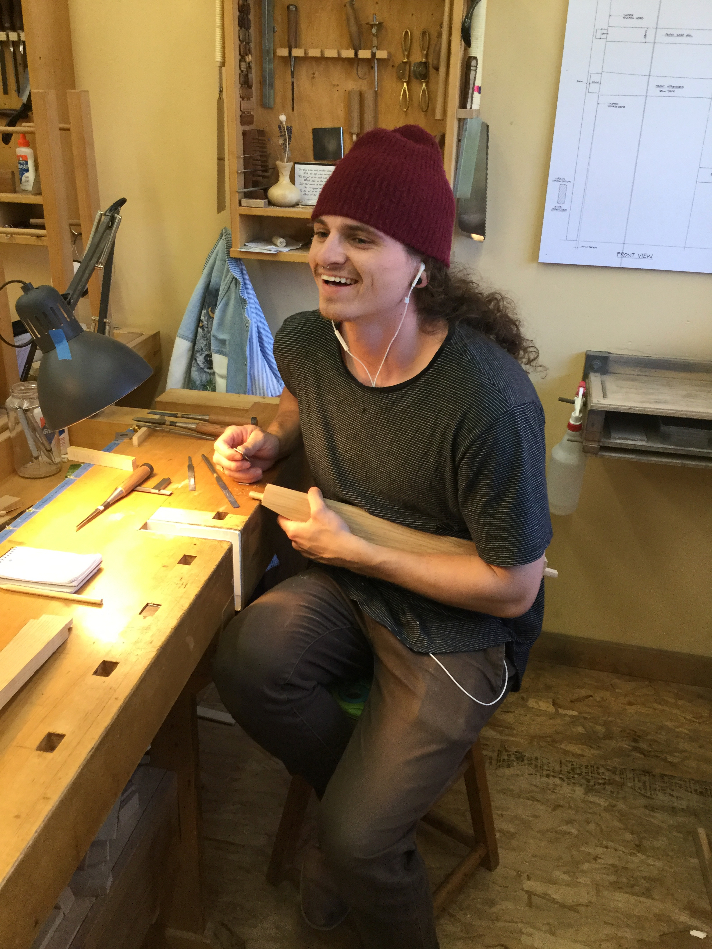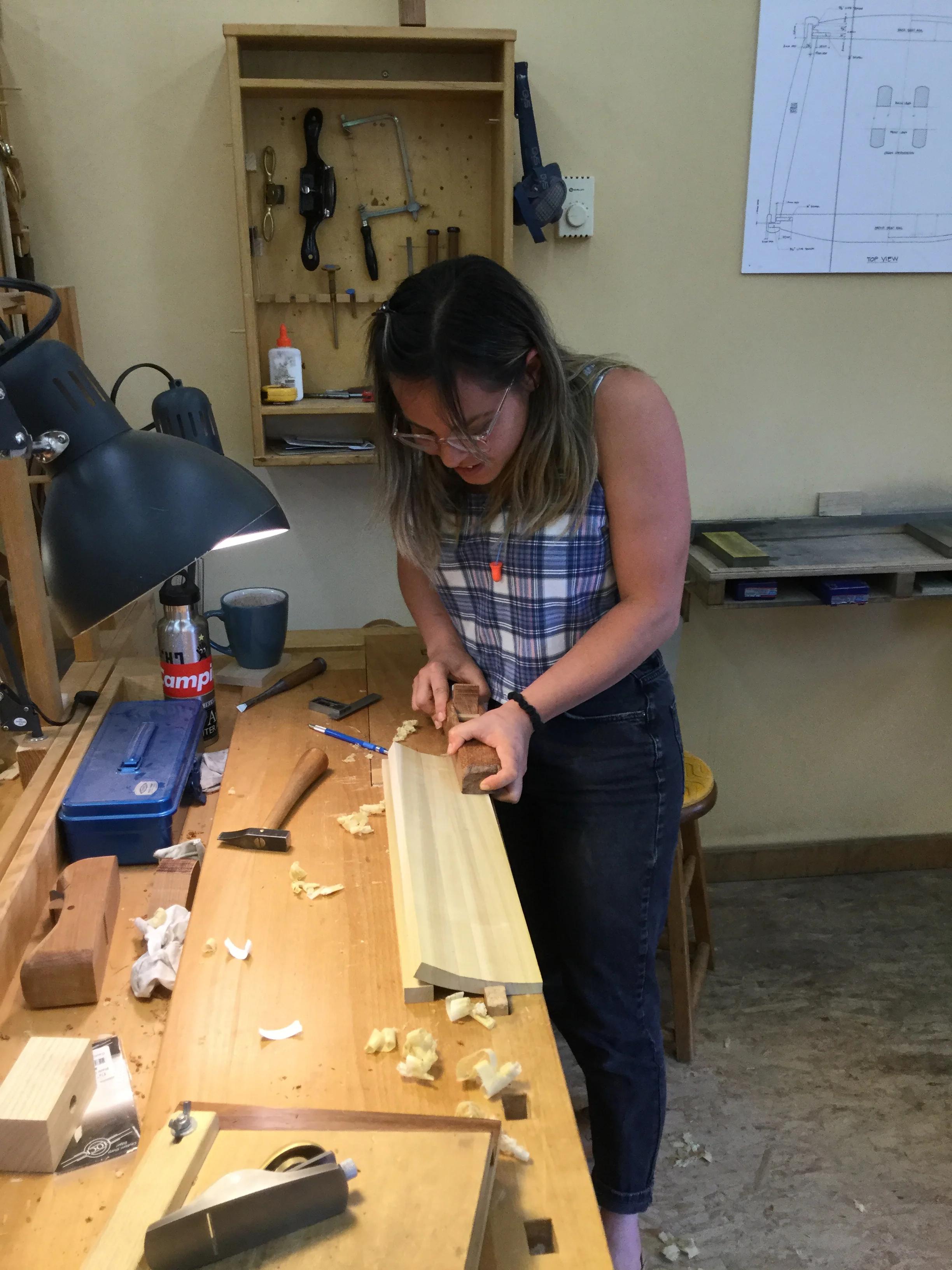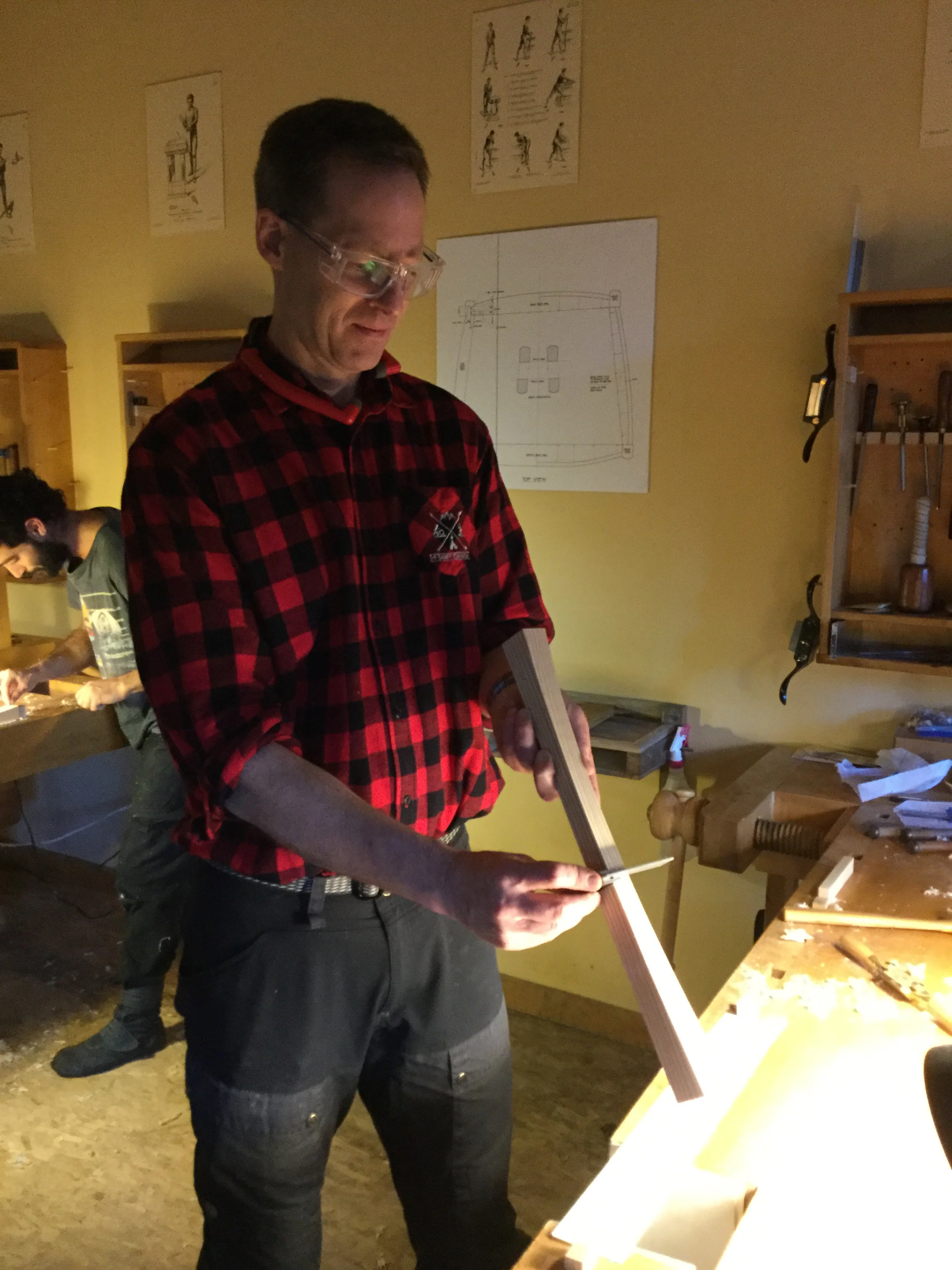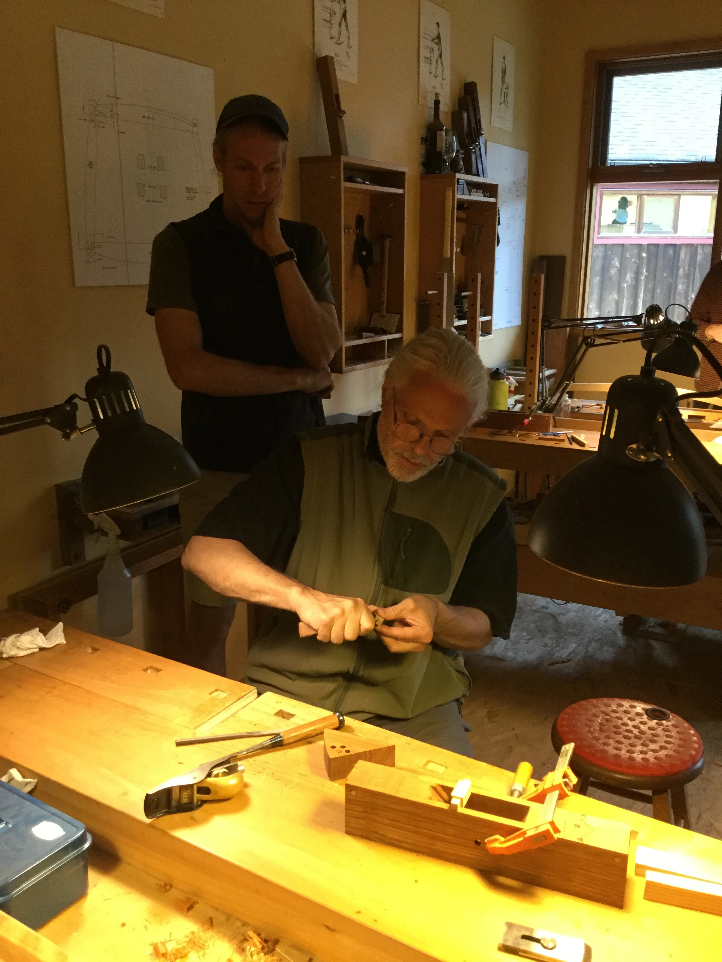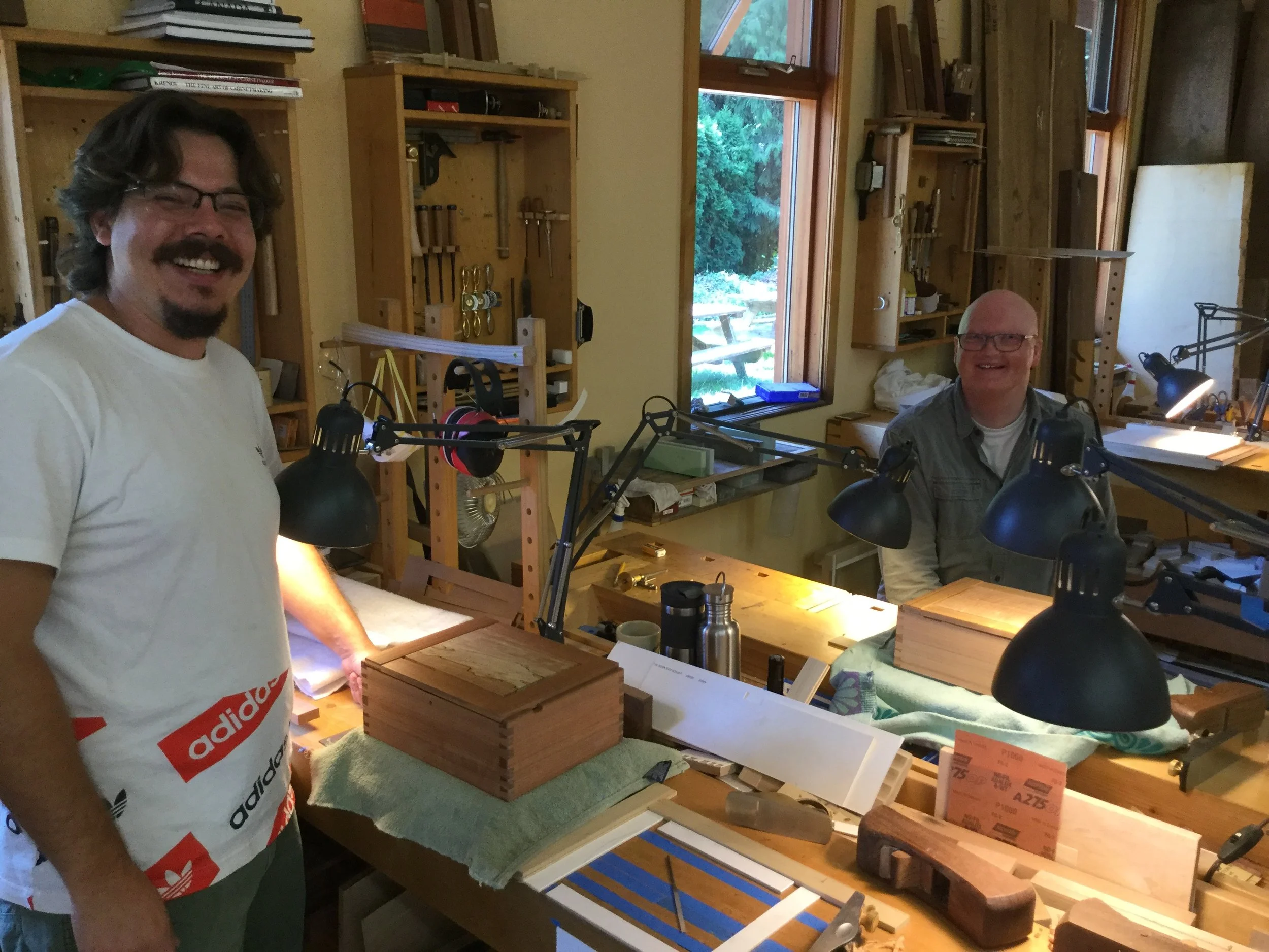 We had a full complement of students for both classes. The first class, curved bottom planes, began on the Sunday, with more than half the class staying on for the second class, curved frame and panel. In the second class, they had the opportunity to use the planes made in the first class to shape the panels in the latter. On the Tuesday evening, I gave a talk and slideshow with several of our own alumni as well as many students from each of the previous classes we taught in Israel attending. I am so grateful for all making such a considerable effort to join us. Most notably, it was so nice to catch up with Chen, Amir and of course Refeal who took both classes. It was also such a pleasure to catch up with my friend Moshe who was my bench mate during my first visit to Israel six years ago. I felt very grateful to have him in the second class.