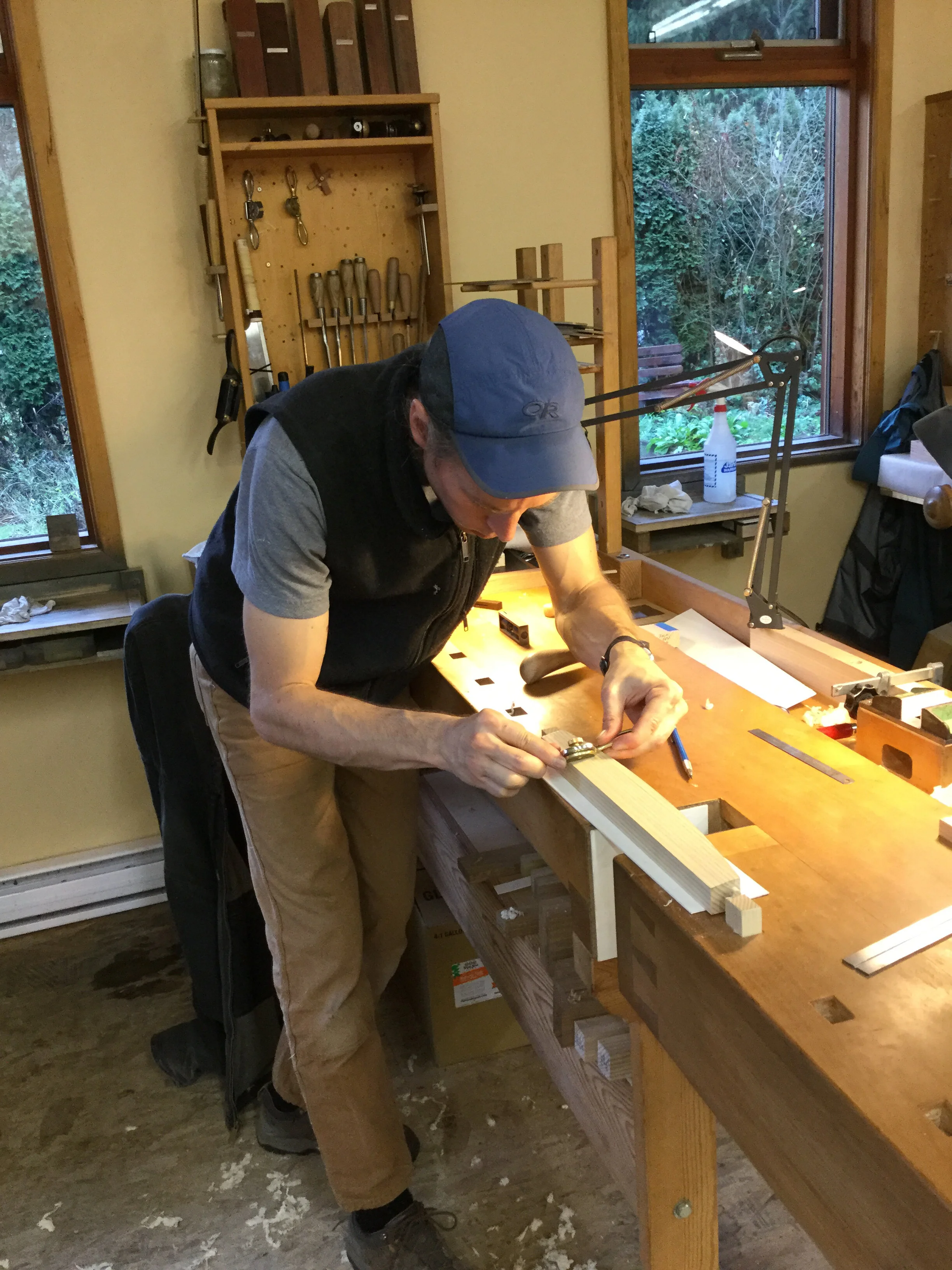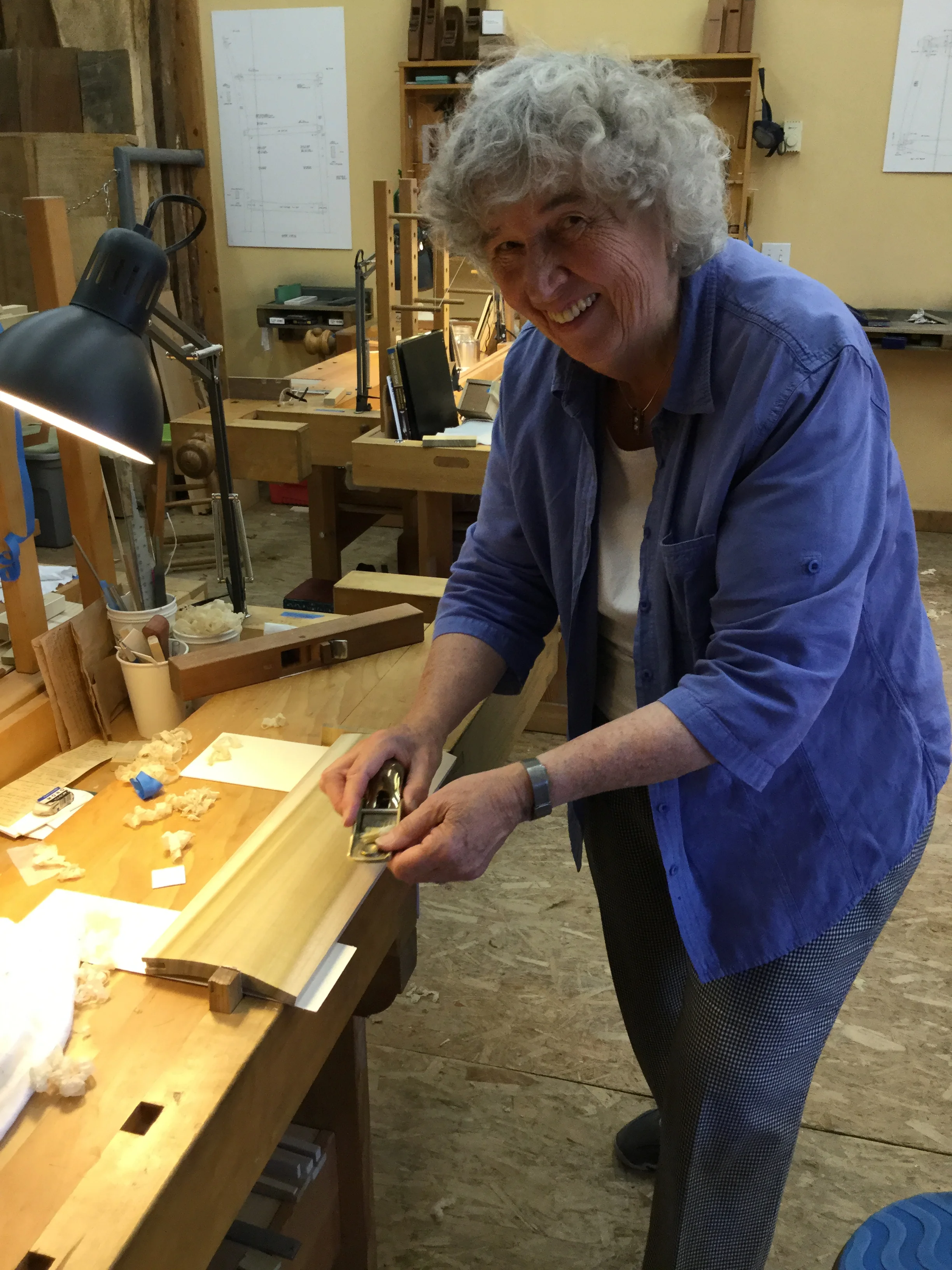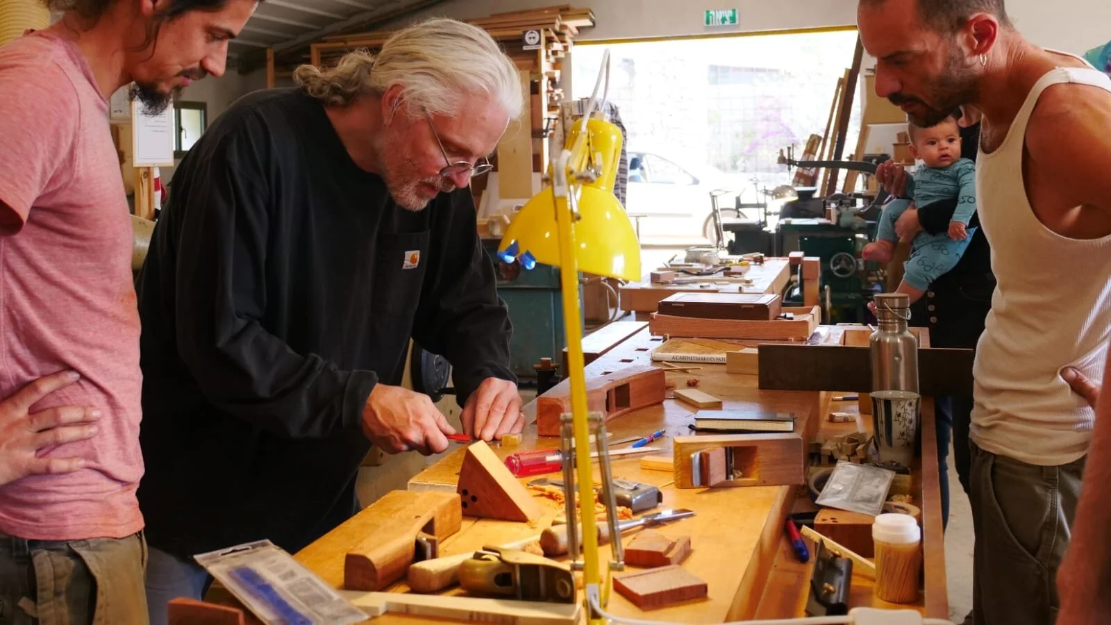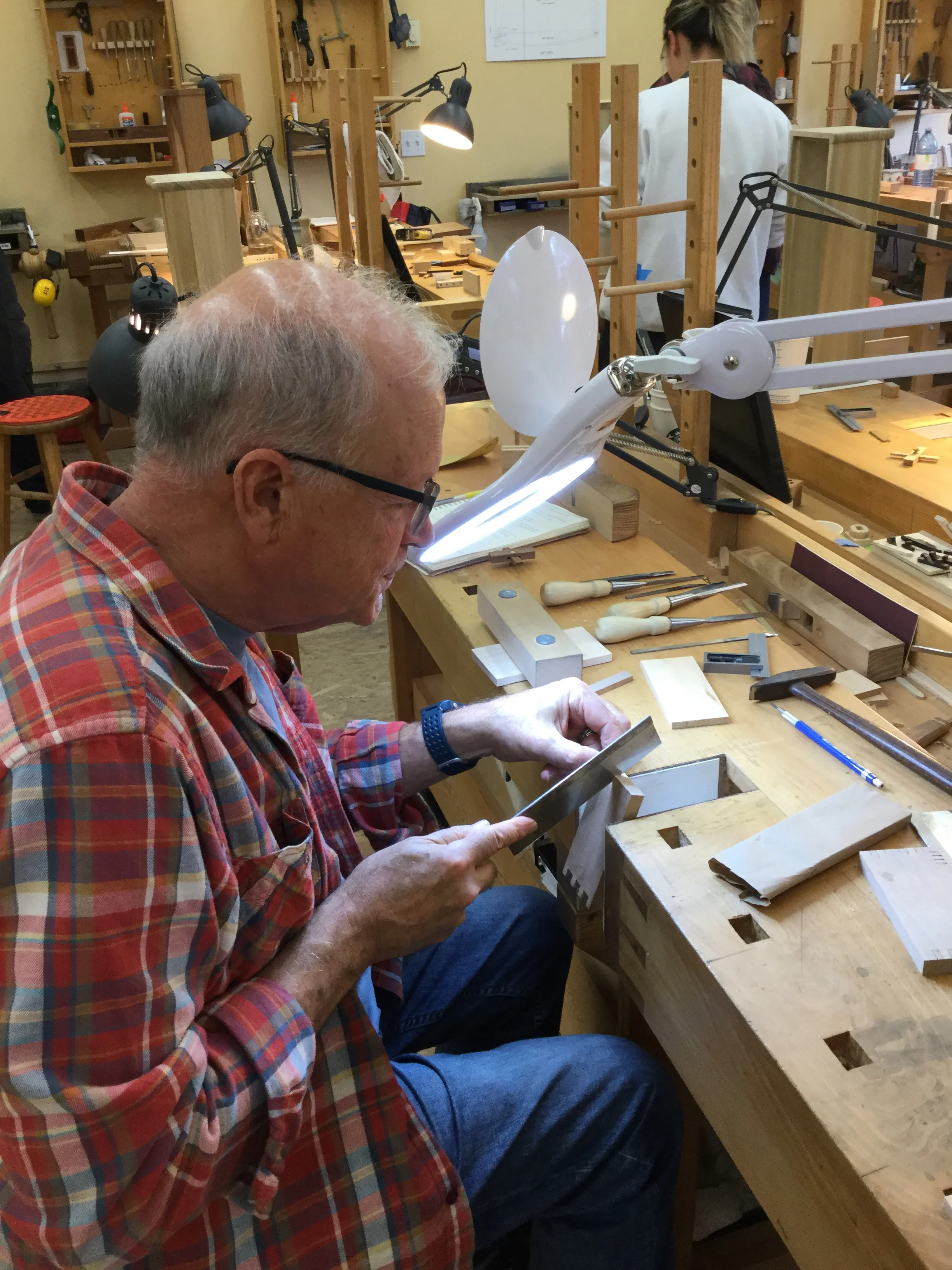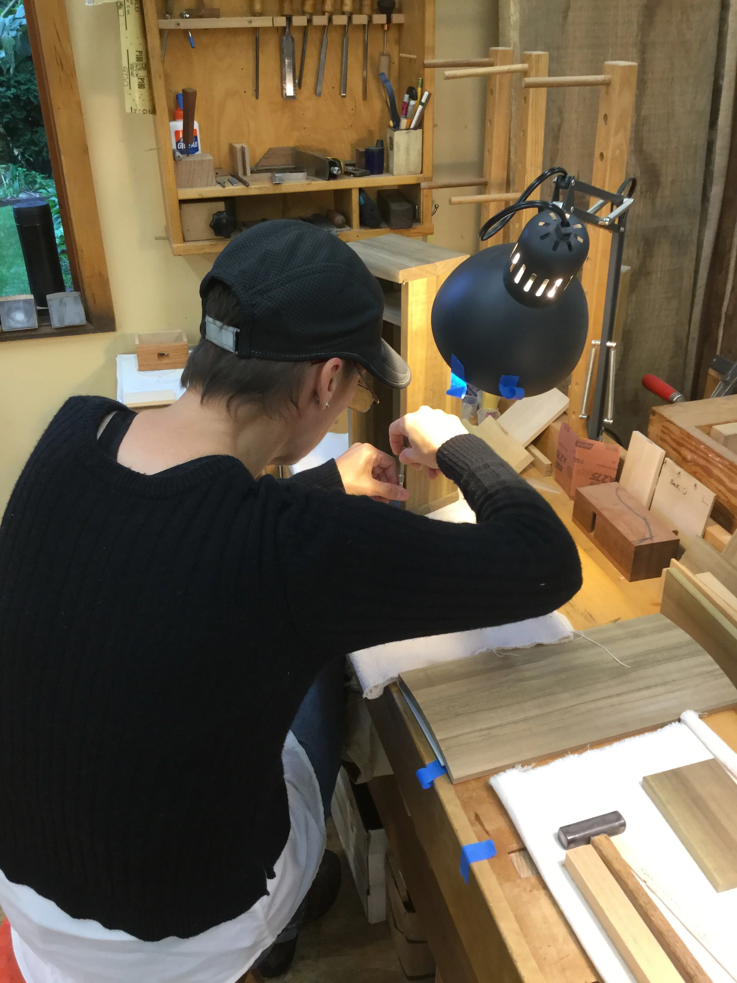 We had a full complement of students for both classes. The first class, curved bottom planes, began on the Sunday, with more than half the class staying on for the second class, curved frame and panel. In the second class, they had the opportunity to use the planes made in the first class to shape the panels in the latter. On the Tuesday evening, I gave a talk and slideshow with several of our own alumni as well as many students from each of the previous classes we taught in Israel attending. I am so grateful for all making such a considerable effort to join us. Most notably, it was so nice to catch up with Chen, Amir and of course Refeal who took both classes. It was also such a pleasure to catch up with my friend Moshe who was my bench mate during my first visit to Israel six years ago. I felt very grateful to have him in the second class.