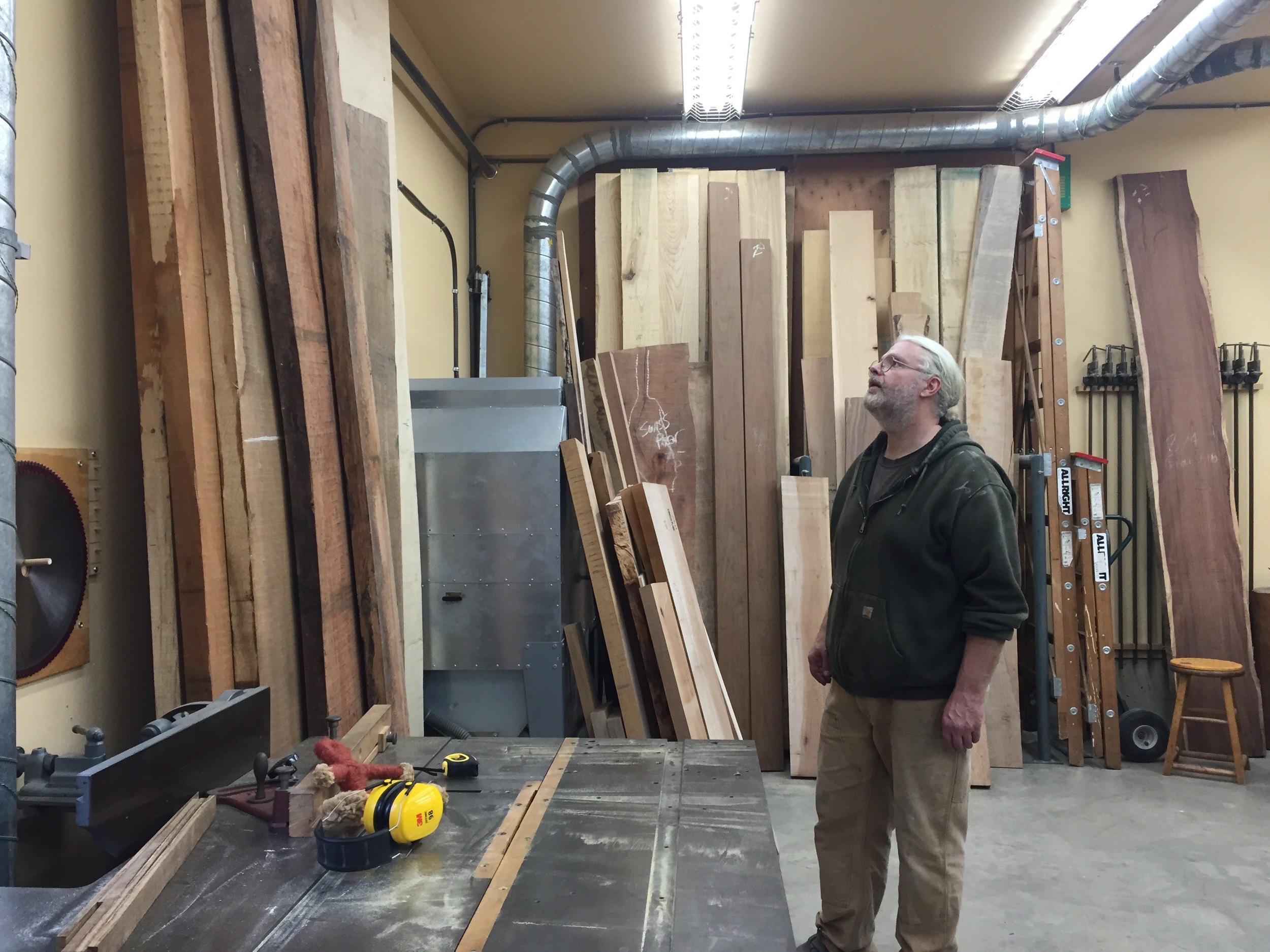 Jesse scrubs a piece of English Walnut for his cabinet